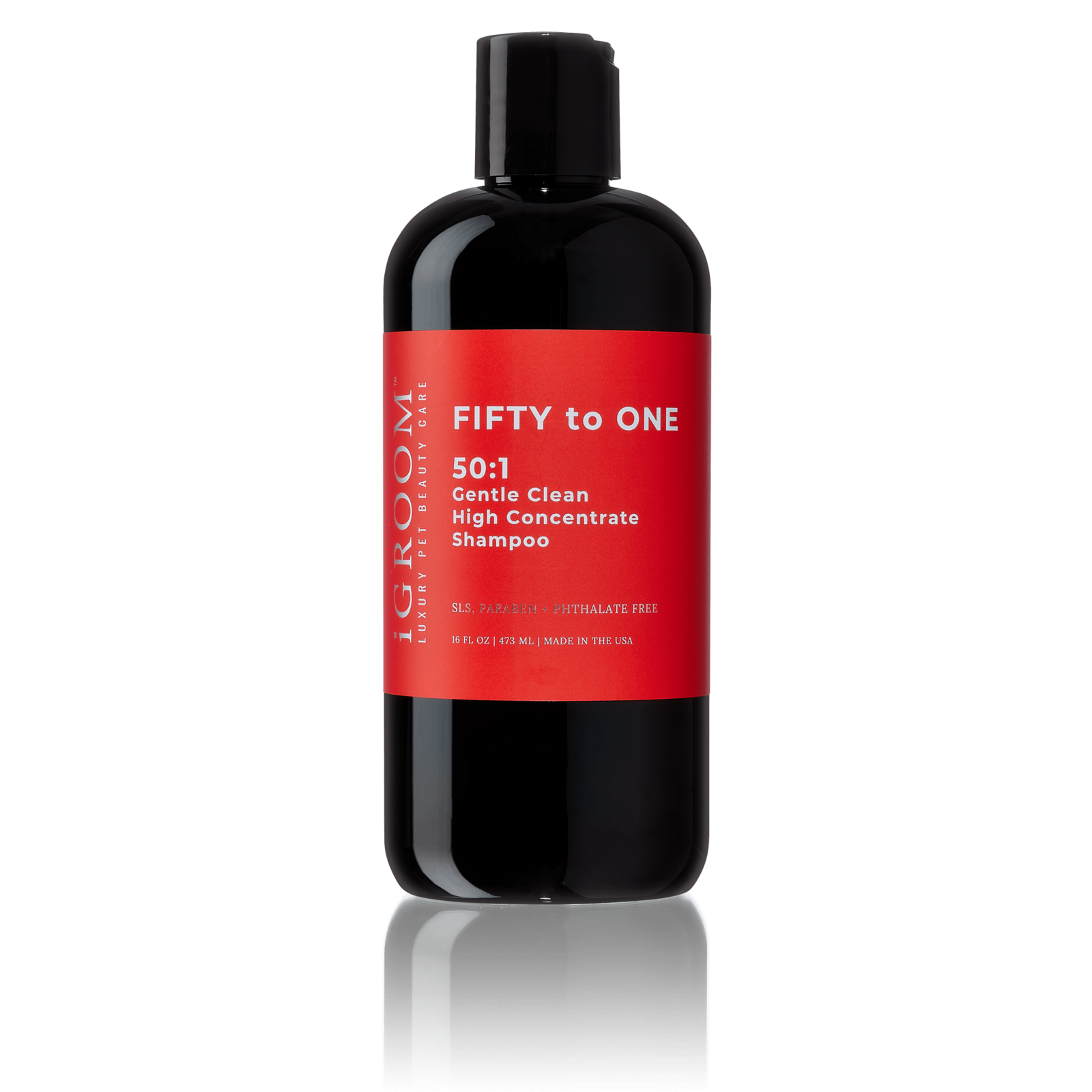 iGroom Fifty to One ultra high concentrate naturally-derived shampoo gently removes grime, dirt, and odors. Formulated with naturally derived ingredients including Chamomile extract, Sunflower extract, and Chestnut extract, soothe and condition the skin. It is pH balanced and is safe for dogs, cats, and horses.