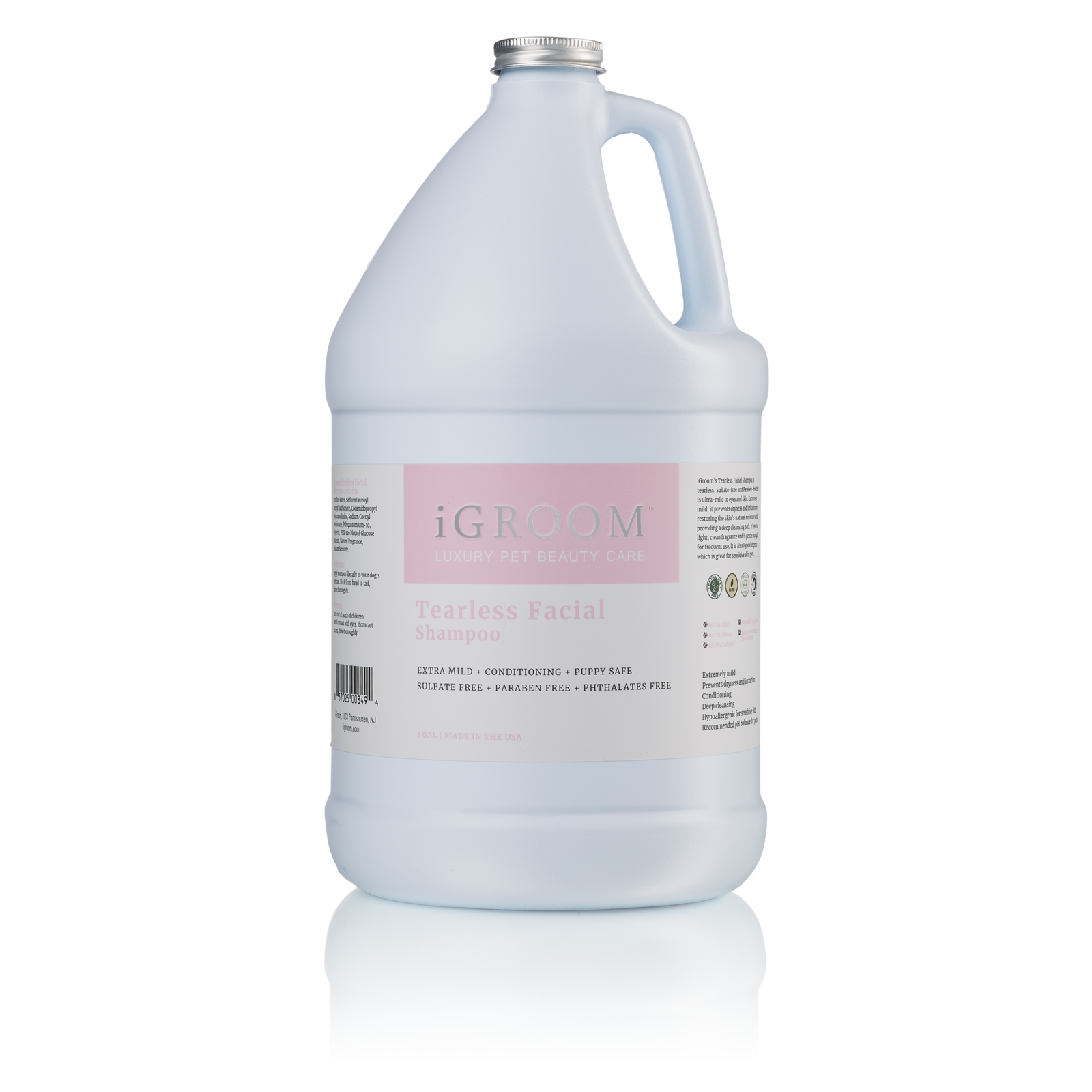 iGroom's Tearless Facial Shampoo is ultra-mild to eyes and skin with sulfate-free and Paraben-free. With extremely mild surfactant, it prevents dryness and irritation by restoring the skin’s natural moisture while providing a deep cleansing bath. It leaves a light and clean fragrance and is gentle enough for frequent use. It is also hypoallergenic which is great for pets with sensitive skin.