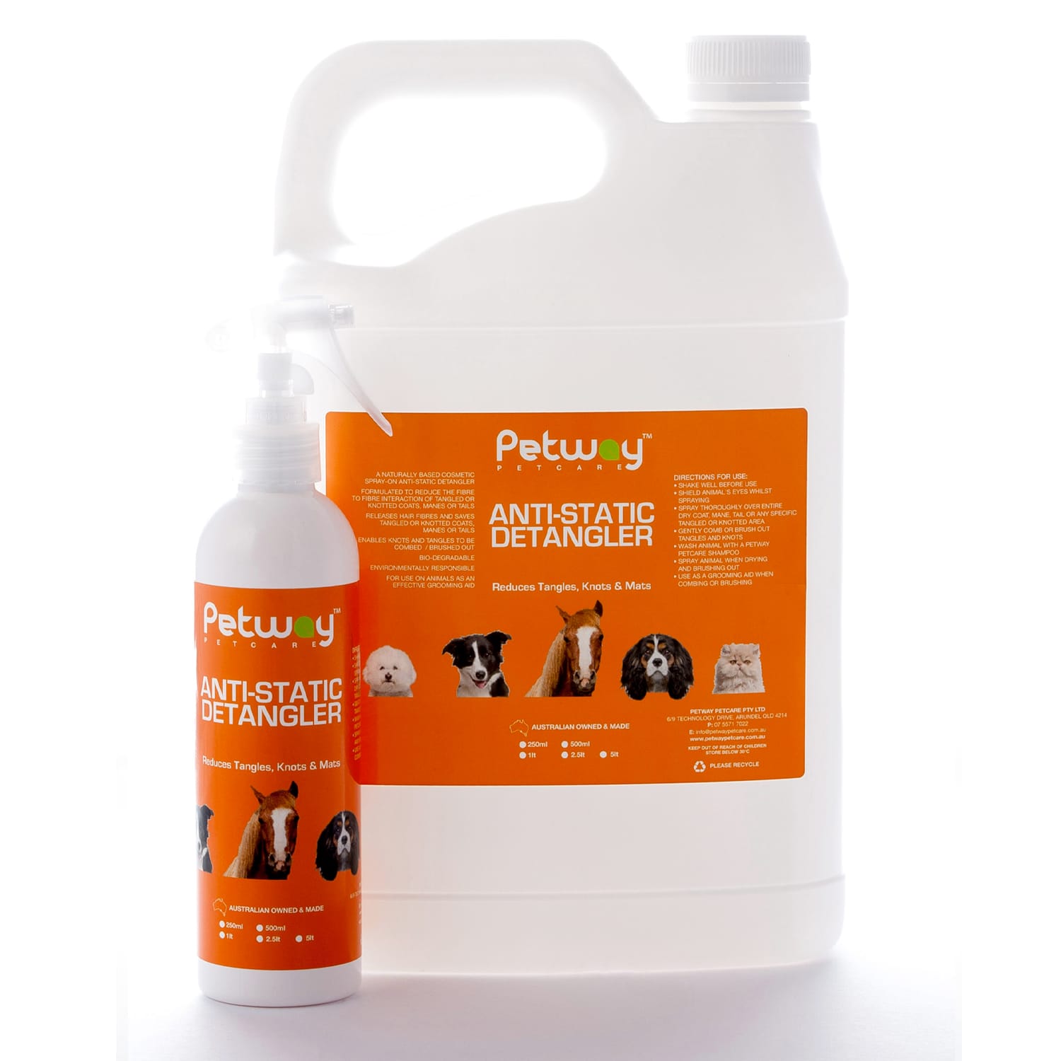 Petway Petcare Anti-Static Detangler is a naturally based, fragrance free detangling spray. Can be used as a pre-wash detangler for dogs, cats and horses and as a combing/brushing aid when drying and as a daily grooming aid. Formulated to reduce the fibre to fibre interaction of tangled or knotted coats, manes or tails. Enables knots and tangles to be brushed or combed out. The detangling spray is fragrance-free with non-irritating additives leaving your pet happy and tangle free.