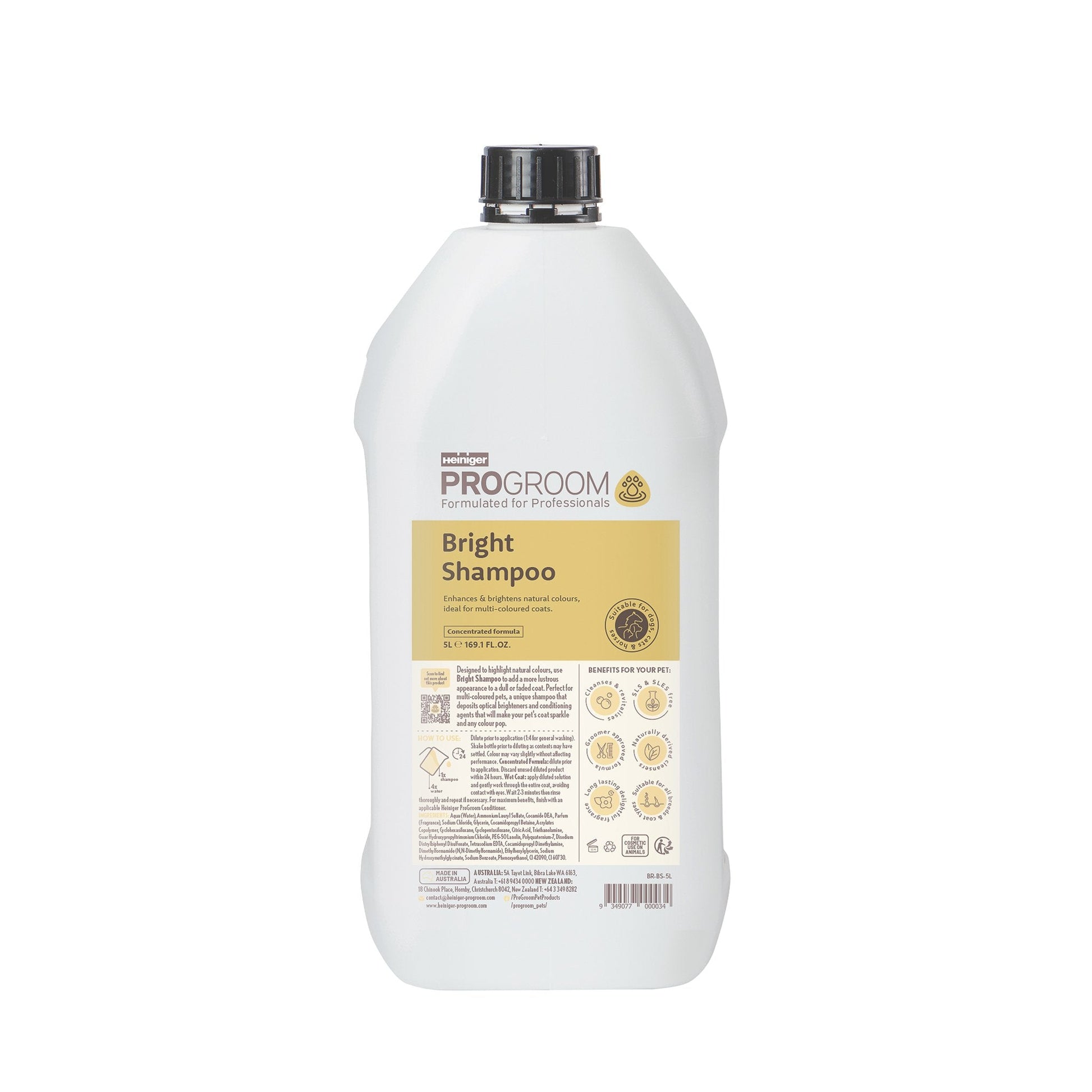 ProGroom™ Brightening Shampoo previously known as Pro Blue is designed to enhance coat colors and to optimize the lustrous appearance of the coat. It contains a proprietary optical brightener that will makes coats bright and colors pop.
