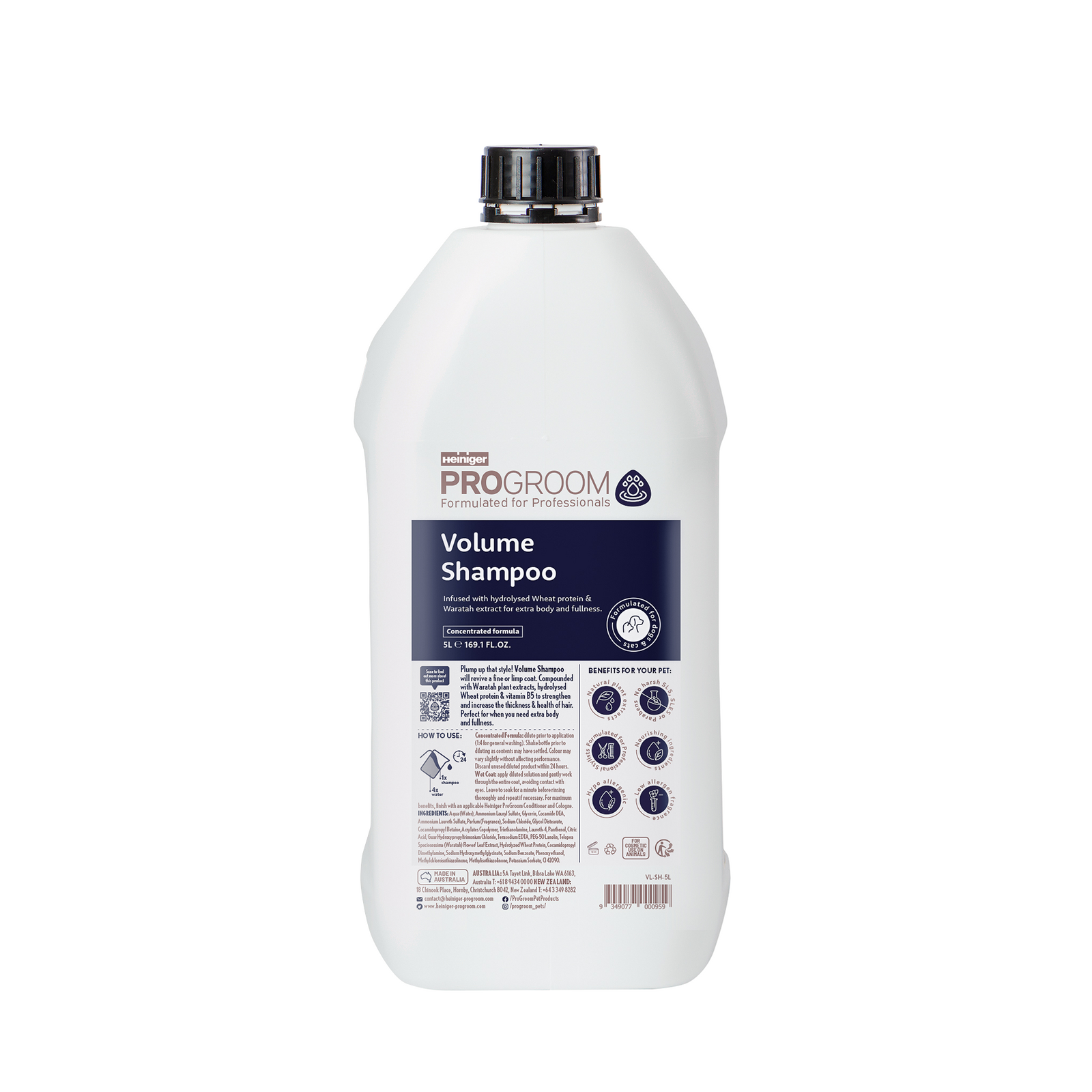 Plump up that style! Infused with hydrolysed Wheat protein & Waratah extract for extra body and fullness, Volume Shampoo will revive a fine or limp coat. It contains vitamin B5 to strengthen & improve the overall health of the hair which makes it perfect for show days when you need that extra boost.